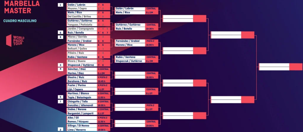 La suite des huitièmes de finale aura lieu aujourd’hui, avec les entrées en lice de Lima / Navarro, Belasteguin / Tapia, ou encore Diaz / Sanchez. On suivra attention la rencontre entre Ramos / Vasquez et Alba / Gil. En effet, ces deux derniers, 76èmes au classement du WPT, ont démarré au premier tour des previas et ont enchaîné trois victoires en 3 sets ! Les joueurs entraînés par Adrian Caviglia, qui a coaché Léa Godallier et Laura Clergue hier, peuvent-ils encore créer l’exploit aujourd’hui ?