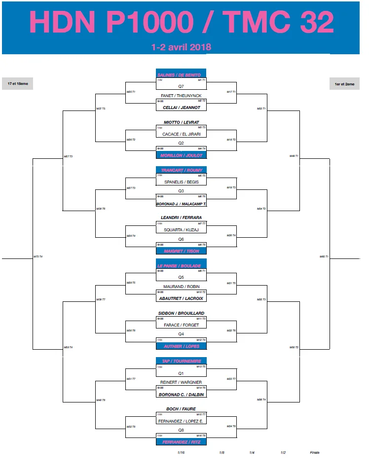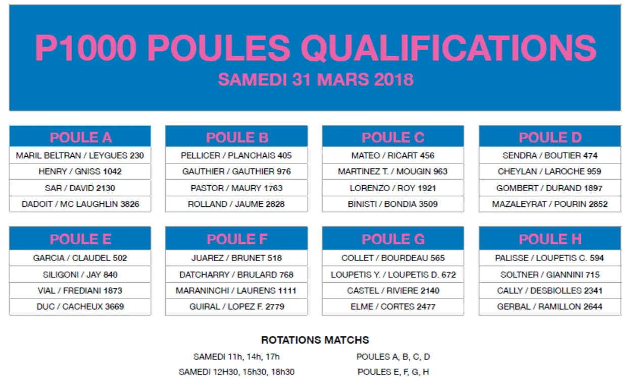 Chez les messieurs, nous débuterons pas des matchs de poules. Comme d’habitude dans un P1000, le niveau y est déjà relevé. Pour y sortir, il va falloir être très bon. Les phases finales auront lieu dimanche.