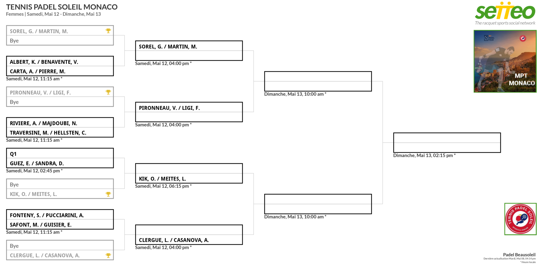 Chez les dames, le tableau est un peu plus clair puisque la paire Sorel / Martin devra faire un bon match face à la probable paire Pironneau / Ligi pour atteindre la finale tandis que Casanova / Clergue est la grande favorite de son bas de tableau… Même si il faudra faire attention face à l’éventuelle paire Kik / Meites en demi-finale…