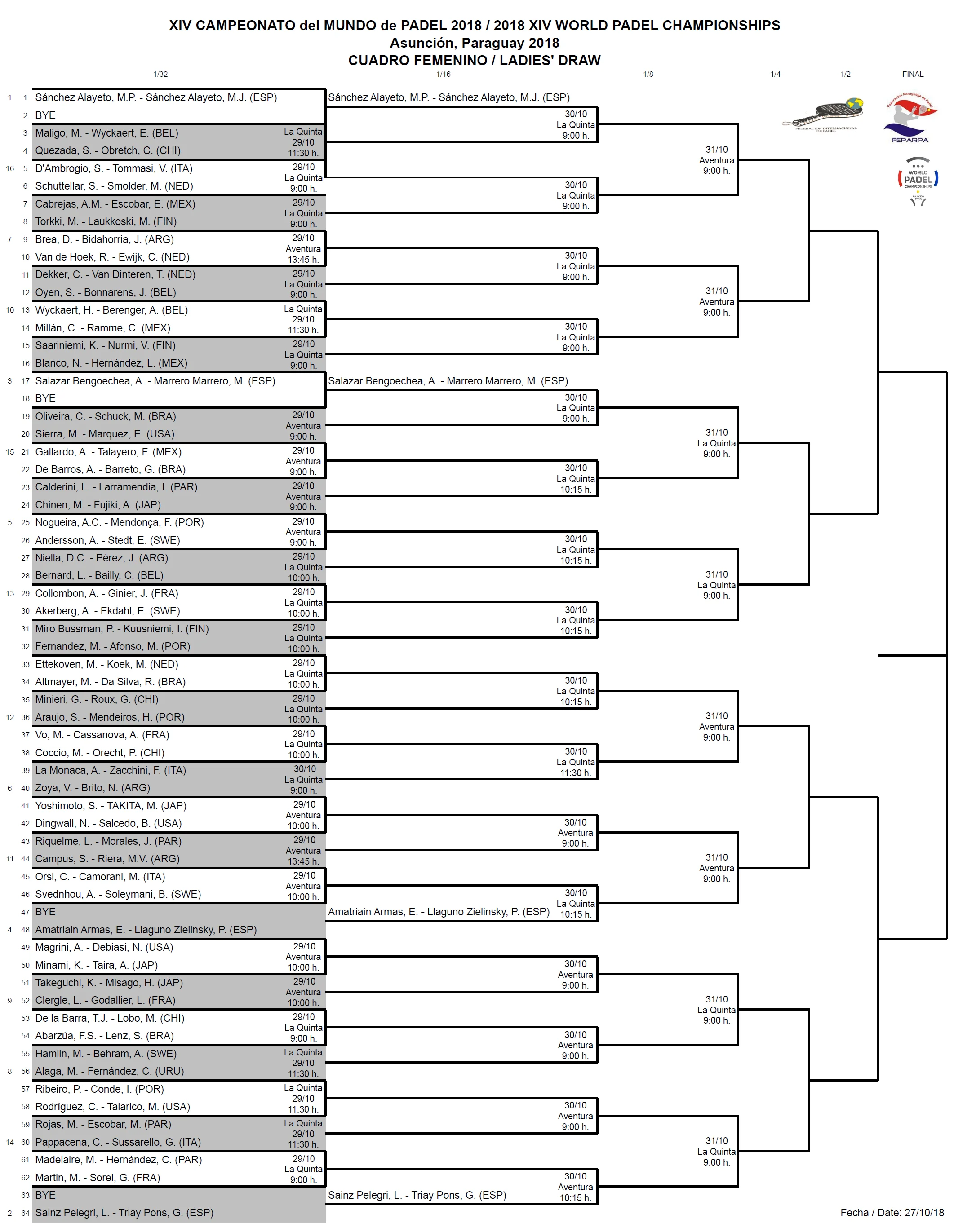 Vous aurez d’abord les tableaux dames et messieurs des championnats du monde de padel par équipe puis ensuite le mondial par paire.