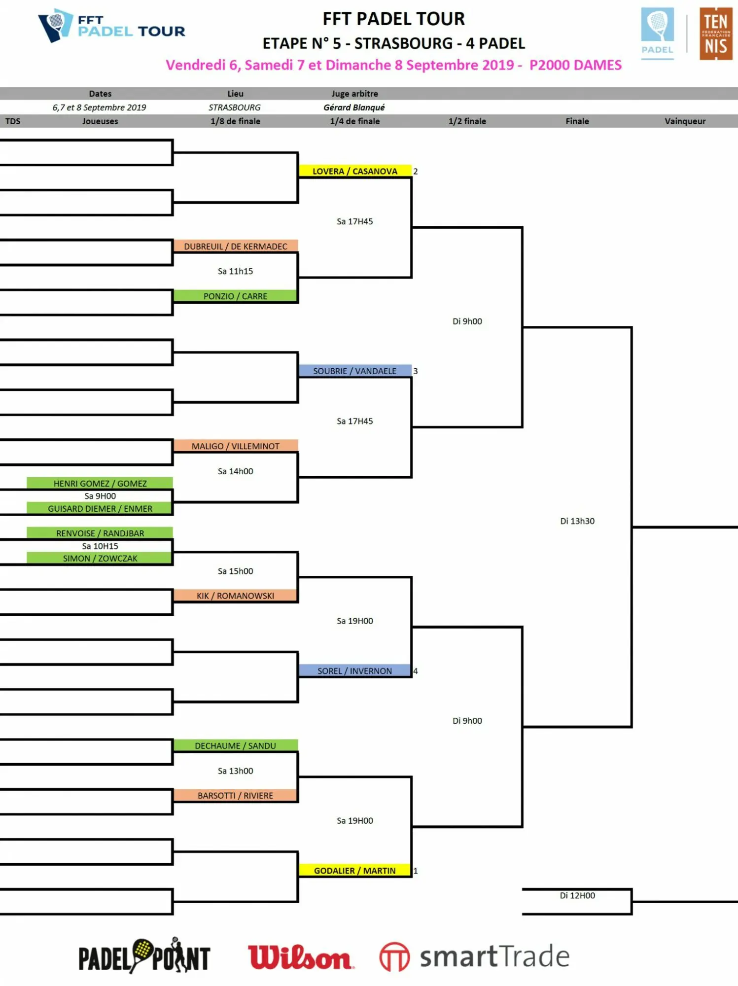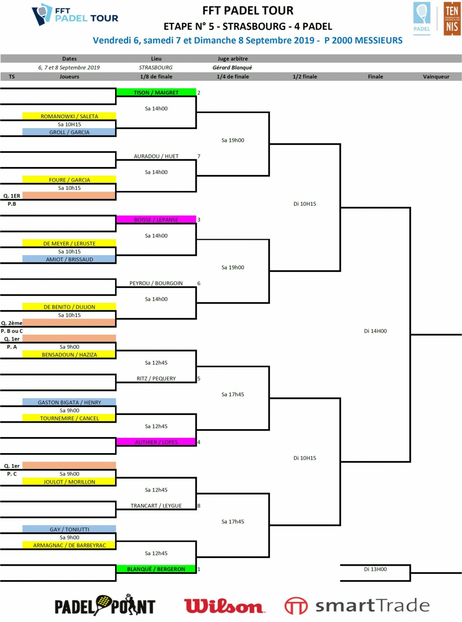 Retrouvez les tableaux dames et messieurs du FFT Padel Tour Strasbourg 2019, 5e étape du circuit élite de padel organisée par la Fédération Française de Tennis, qui a lieu au 4PADEL Strasbourg avec ses nouvelles installations du 6 au 8 septembre