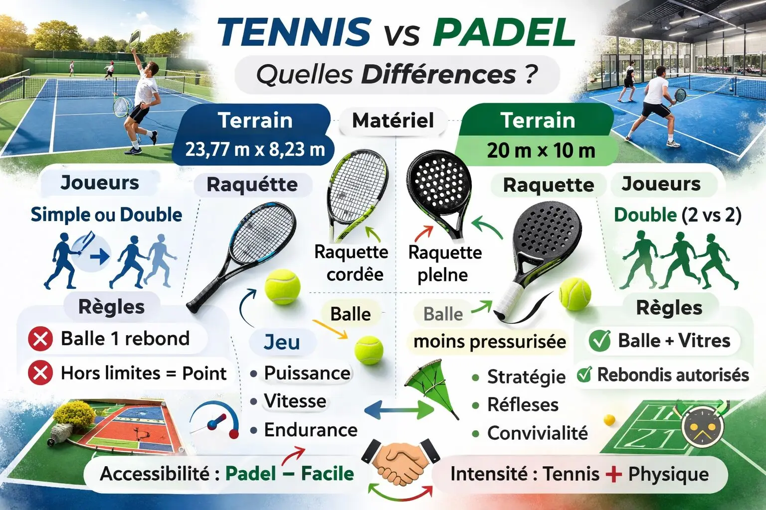 Le padel est plus accessible, plus collectif et plus stratégique, avec un jeu basé sur les rebonds et les angles.