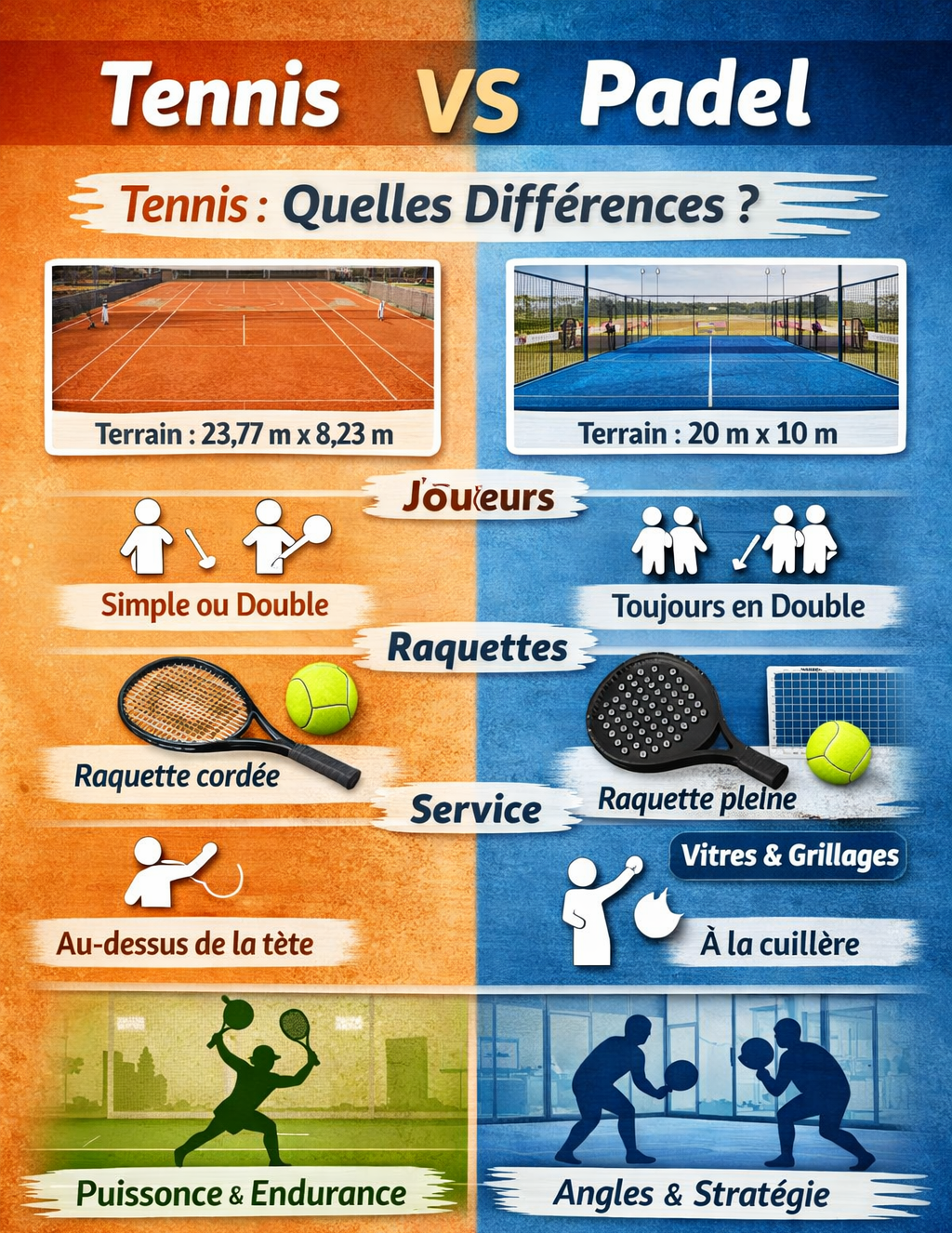 Le tennis et le padel sont deux sports de raquette proches dans leur logique de jeu, mais très différents dans leur pratique, leur accessibilité et leur dynamique. Voici un comparatif clair et structuré.