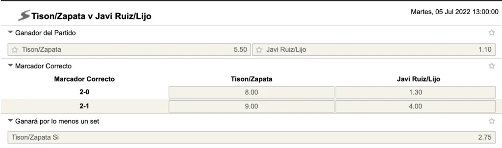 La victoire de Ben et Teo est cotée à 5,50, affirmant donc qu’il faudra faire un exploit pour se qualifier pour les huitièmes ! Tison/Zapata gagne au moins un set est coté à 2,75.