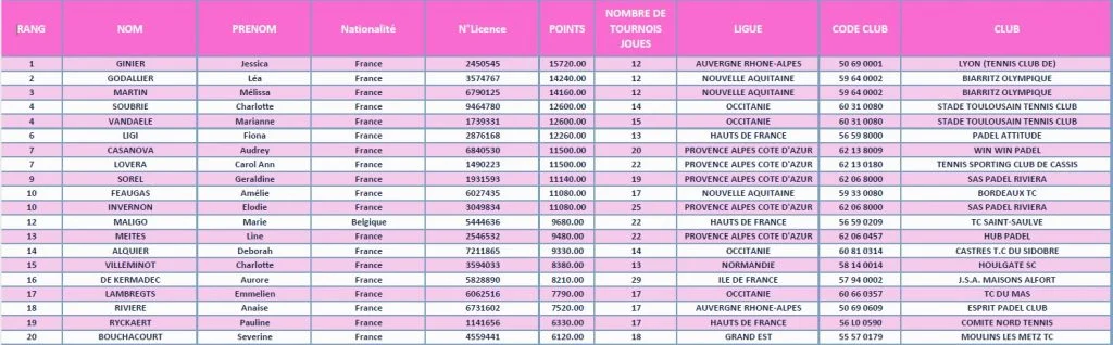 La jeune Fiona Ligi arrive 6e. C’est certainement la joueuse qui a le plus subi sur la seconde partie de saison avec un forfait lors des championnats de France de padel (à cause de la blessure aux pieds de son ancienne partenaire, Laura Clergue), une non convocation dans la team France pour les Europe 2019 à Rome, et qui se retrouve pour l’instant sans partenaire officielle pour 2020. Une association Martin / Ligi ?