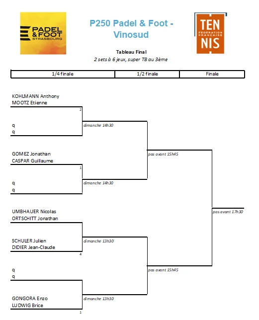Le weekend se poursuivra avec le P250 Hommes : qualification le samedi et tableau final le dimanche après-midi ! On pourrait assister à quelques belles oppositions de style dès les 1/4 de finale ; mais si la logique est respectée, les paires Brice Ludwig (n°263) / Enzo Gongora (n°214) et Anthony Kohlmann (n°162) / Etienne Mootz (n°616) devraient se retrouver en finale pour tenter d’ouvrir leur compteur cette saison. A moins que Jonathan Gomez et Guillaume Caspar en décident autrement…