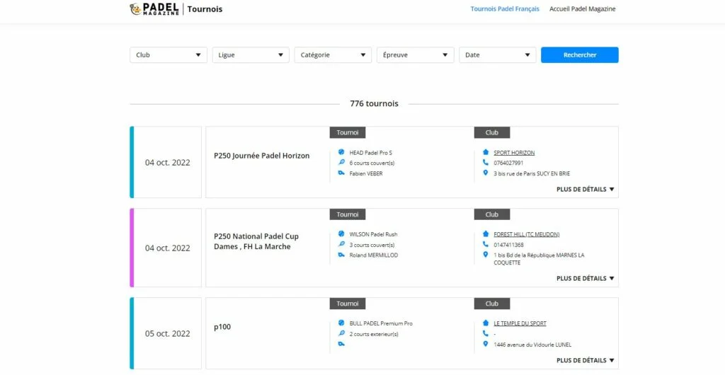 Vous n’avez donc plus d’excuse pour ne pas faire de tournois… Et si vous hésitez encore, Padel Magazine a décidé de vous mâcher le travail, avec sa nouvelle plateforme pensée pour vous : ttps://tournois.padelmagazine.fr/