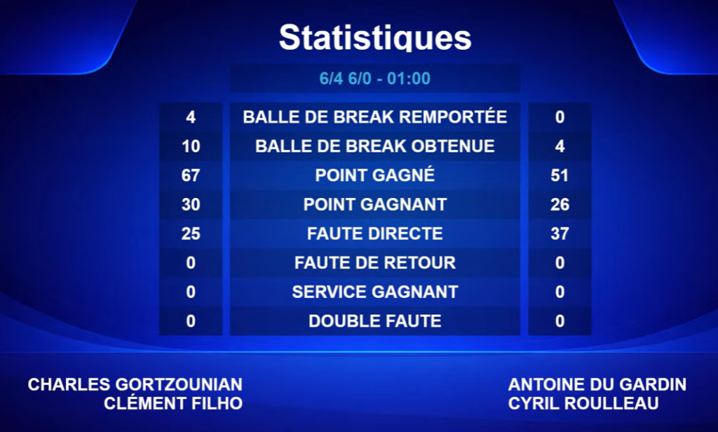 - 25 fautes directes pour les vainqueurs contre 37 pour Du Gardin / Roulleau