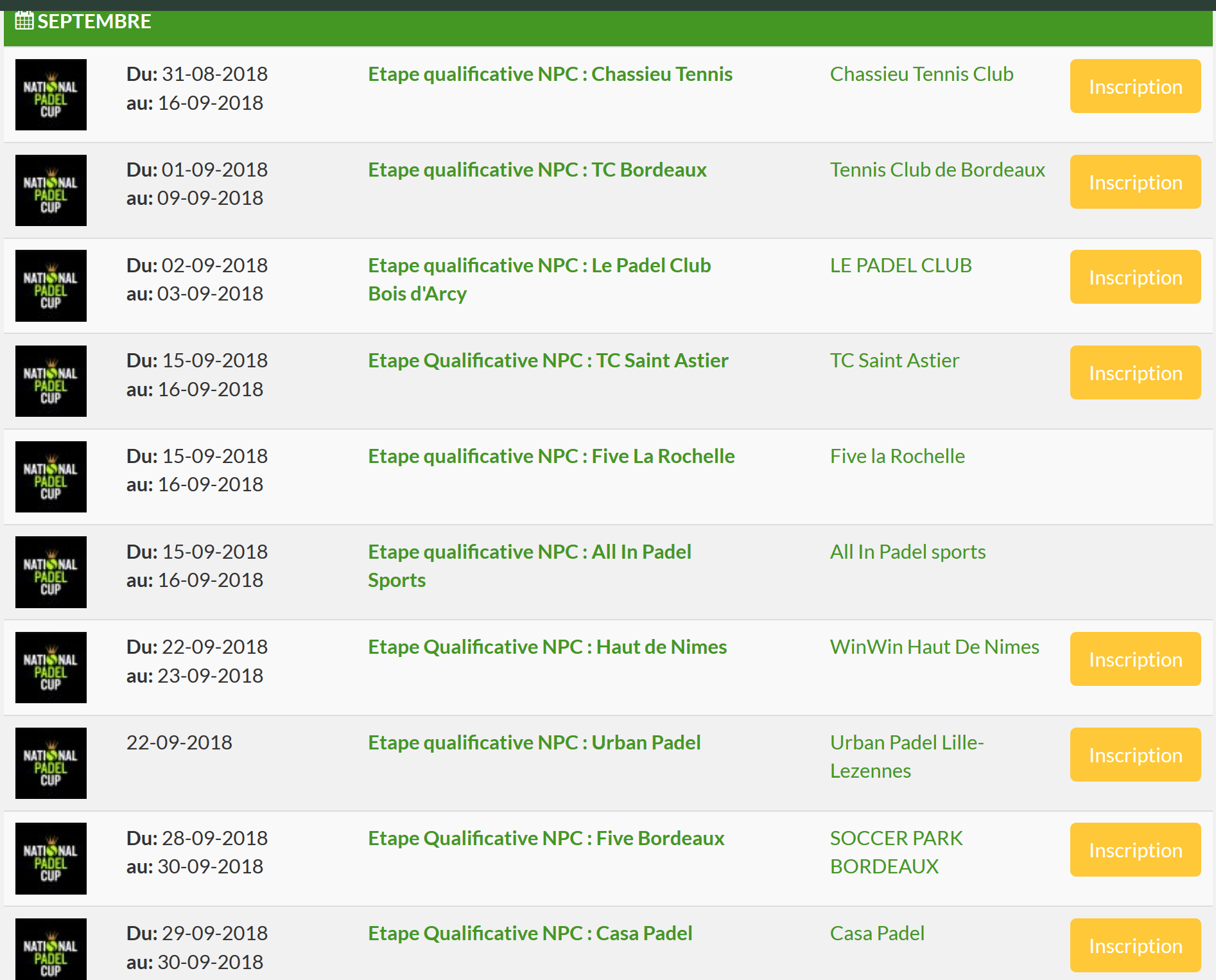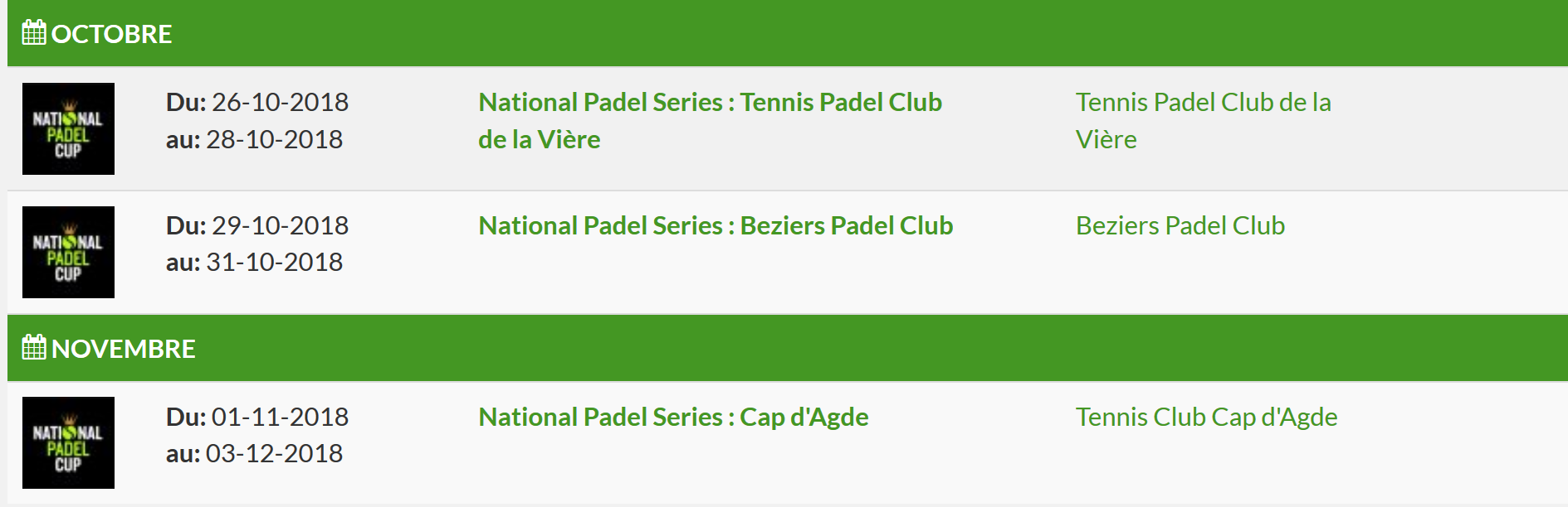 Le calendrier de la National Padel Cup 2018