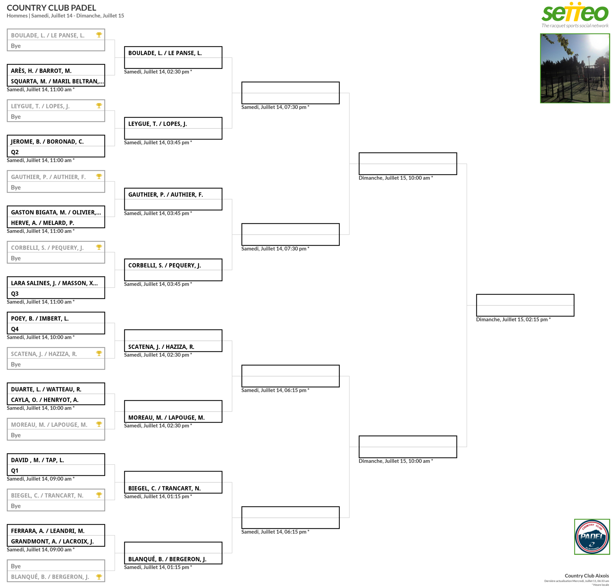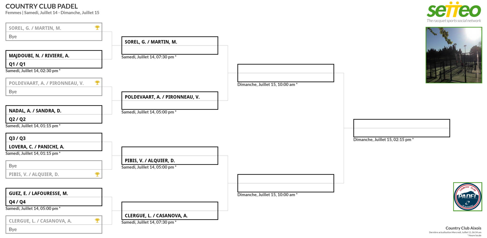 Les tableaux du My Padel Tour du Country Club Padel sont tombés sur Setteo. Chez les messieurs comme chez les dames, le tournoi s’annonce impressionnant avec notamment chez les dames la paire Casanova / Clergue reformée pour ce tournoi. Elle sera la favorite du tournoi, à moins qu’il y ait un exploit de la paire Sorel / Martin.