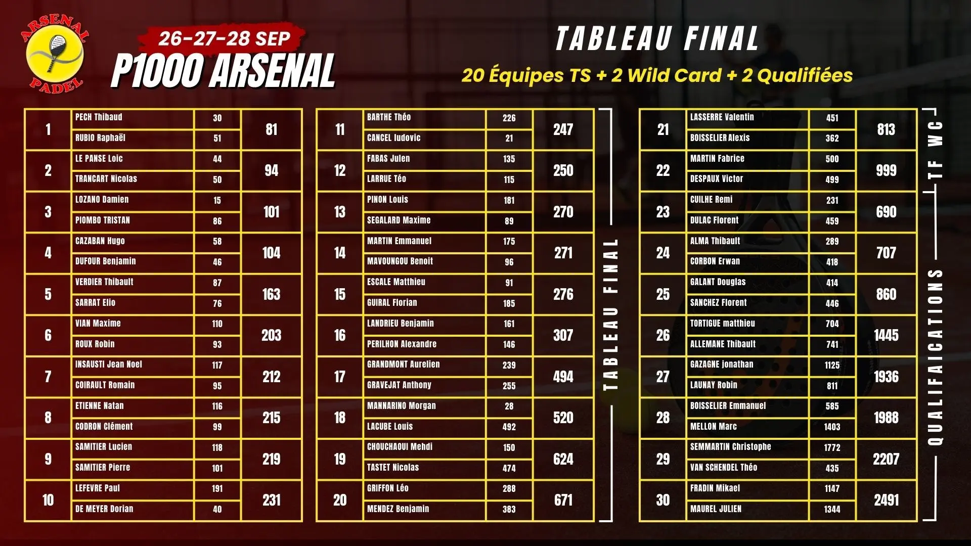 Le P1000 Arsenal Padel (26–28 septembre) s’annonce très homogène. Plusieurs paires peuvent viser le titre et chaque tour devrait offrir de gros match.