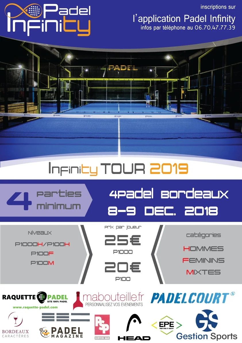 A 460Km de là, au même momoent, au 4Padel de Bordeaux, le 1er P1000 Padel Infinity sera organisé par Alexandre Leruste. Accompagné également de 3 P100 : Masculin, Féminin et Mixte. les 7 terrains du complexe vont être mis à rude épreuve !