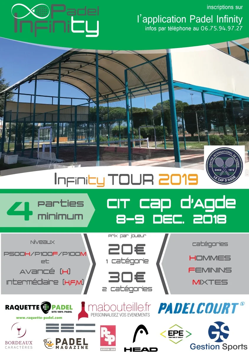 Le 8 et 9 décembre, le CIT du Cap d’Agde accueillera la 2ème étape du Padel Infinity Tour 2019 avec un P500 Homme, un P100 Femme et un P100 mixte + des catégories non homologués comme Masculin Avancé et Intermédiaire, Féminin Intermédiaire et Mixte Intermédiaire. Axel Sabalete sera l’organisateur du tournoi sur place.