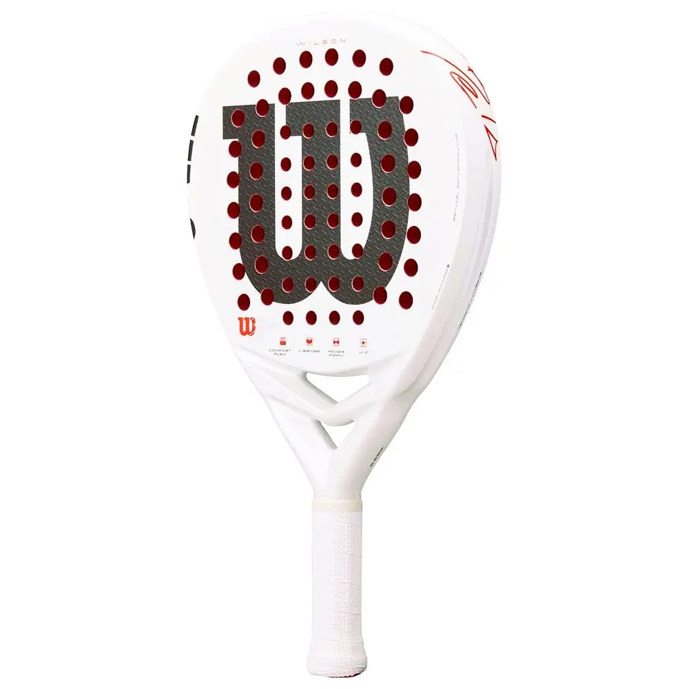 Visuellement, la Bela V3 Pro conserve le design sobre et élégant qui a fait le succès de ses prédécesseurs. La base, d’un noir velouté, est rehaussée par le rouge emblématique de chez Wilson, intense et immédiatement reconnaissable, symbolisant la passion et l’agressivité du joueur argentin. La finition mate est mise en valeur par le logo rouge flamme traité avec un accent plus brillant, tout comme le pont, créant un contraste dynamique et réfléchissant. L’ensemble est parachevé par une surface texturée 3D, conçue pour maximiser l’accroche de la balle et enrichir la palette d’effets.