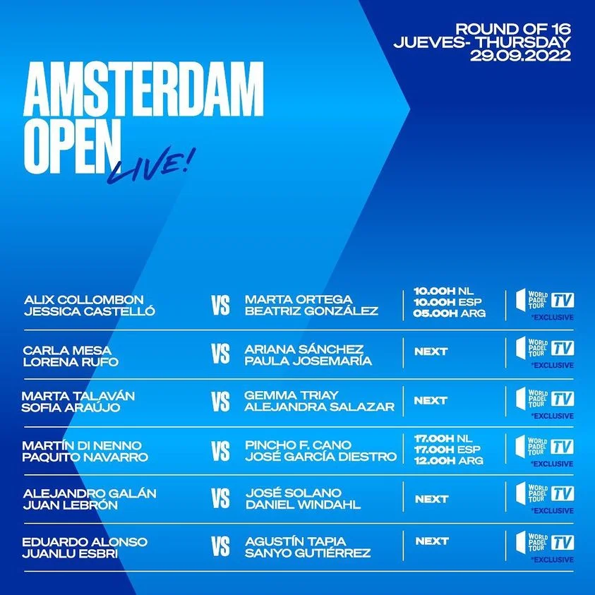 Ensuite, ce sont les nouvelles numéros 1 qui feront leurs débuts à Amsterdam, avec la volonté de prolonger leur série de 16 victoires consécutives. Face à elles ce sont Carla Mesa et Lorena Rufo qui se tenteront de créer l’exploit.