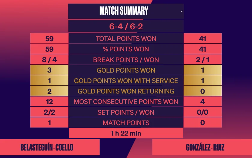 Le deuxième set a démarré pratiquement de la même manière, mais cette fois Ale et Momo n’ont pas réussi à contrecarrer les plans d’un Bela et d’un Coello en mission. Bien conscients de l’enjeu, ceux qui formaient la tête de série 5 de ce Madrid Master, n’ont jamais relâché la pression. Comme vous le verrez dans les statistiques, le succès est on ne peut plus mérité pour la paire hispano-argentine, qui aura évolué à un très haut niveau aujourd’hui.