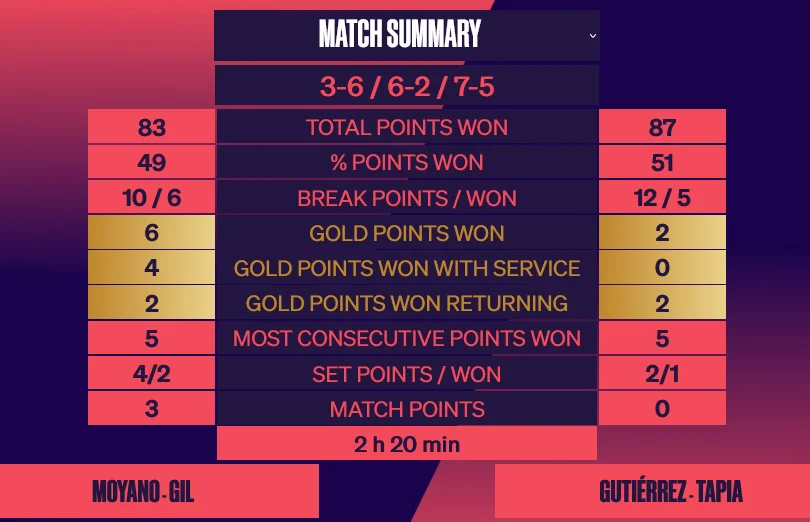 Dans ce match, Moyano et Gil ont fait preuve de beaucoup plus de réalisme que leurs adversaires sur les “punto de oro”, puisqu’ils en ont remporté six contre deux.