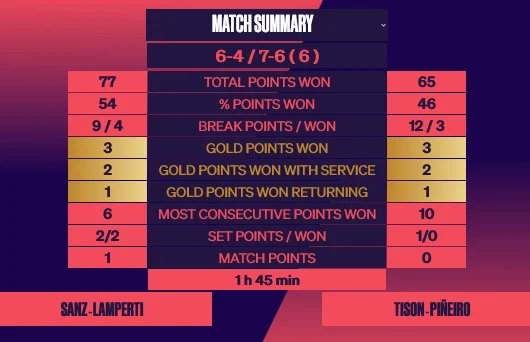 Comme vous le voyez dans les statistiques, si les favoris ont finalement remporté 12 points de plus que Benjamin et Martin, ces derniers ont tout de même réussi à se procurer 12 balles de break dans la rencontre, ce qui n’est pas rien ! Malgré tout, cela reste une victoire méritée pour Sanz et Lamperti qui auront la lourde tâche de se mesurer demain à Ale Galan et Juan Lebron, vainqueurs de Javi Leal et Javi Rico (6/4 6/2).